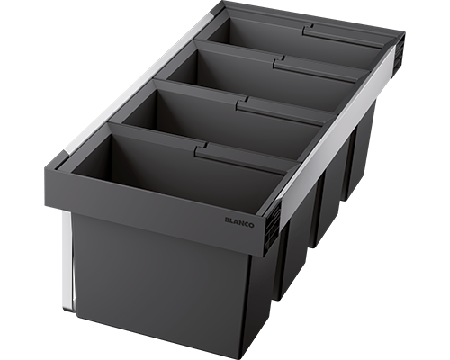 Har du valgt en stor XL-vask som NAYA XL 9, der kræver 90 cm køkkenskab, har du mulighed for at indrette et super praktisk og rummeligt affaldssystem under vasken. BLANCO FLEXON II 90/4 monteres i skuffer under vasken, og vil helt sikkert ikke skuffe dig. Det store system rummer hele fire spande à 19 liter hver og passer derfor super godt i det aktive køkken, hvor der helt naturligt bliver produceret meget affald.