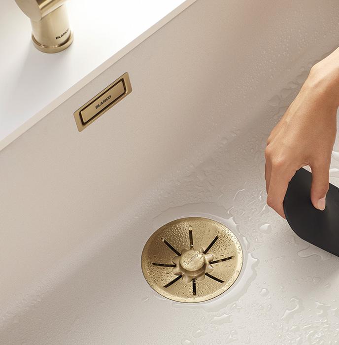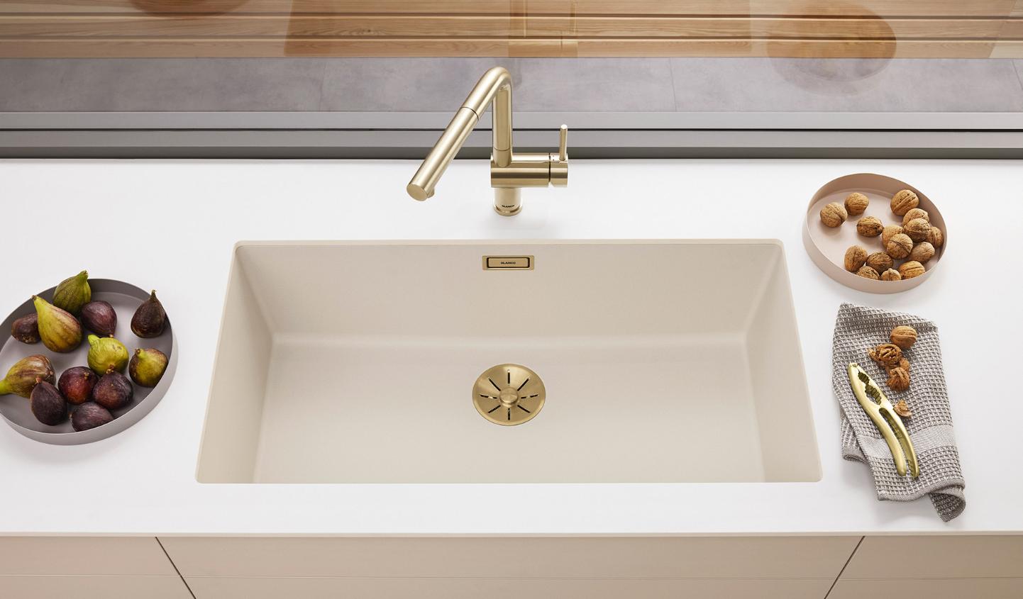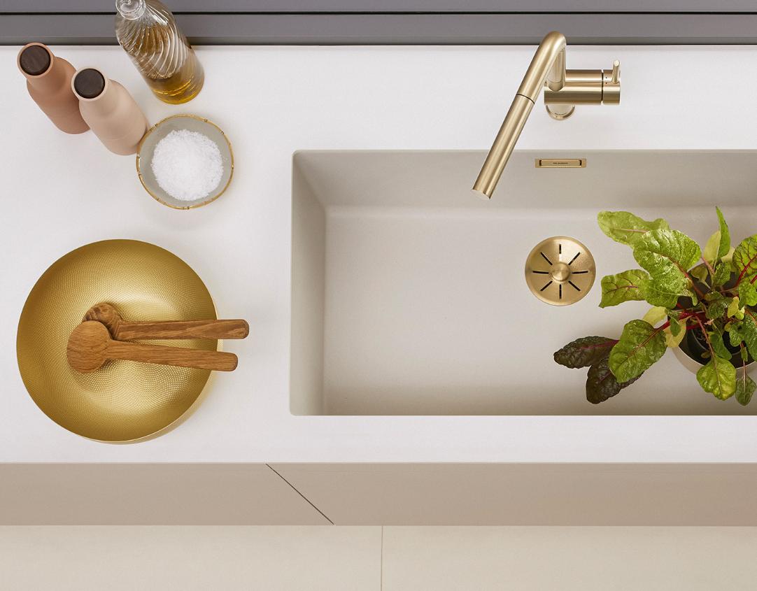 Du kan også kombinere en køkkenvask i soft-white med et armatur, afløbssæt eller andet tilbehør i den elegante satin gold farve, der understøtter den varme farvetone og sætter et eksklusivt og sofistikeret præg på køkkenindretningen.
