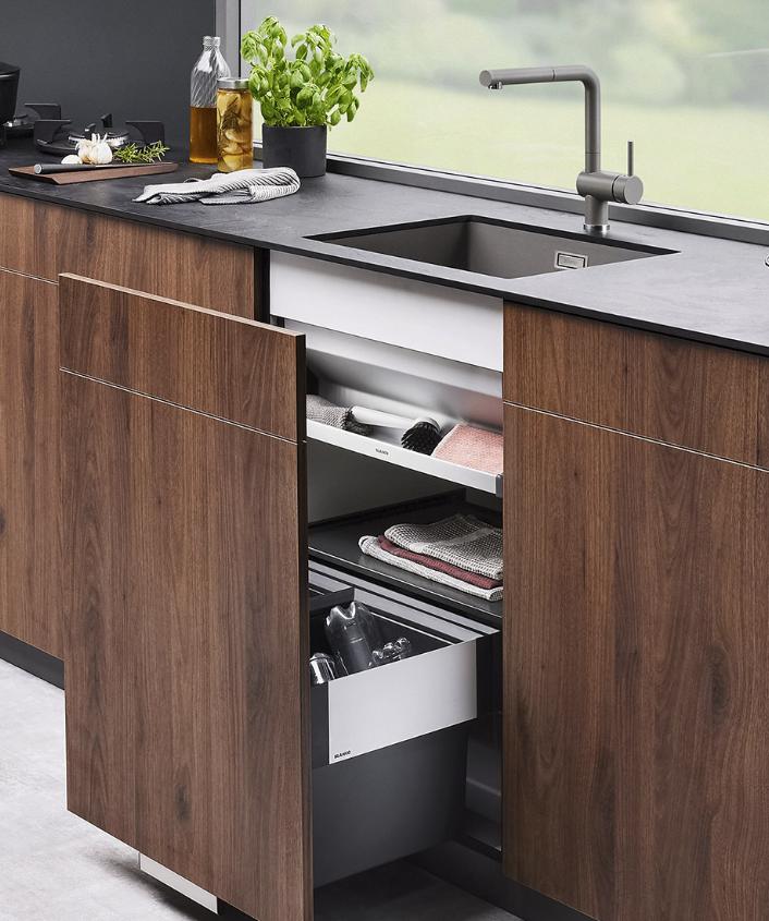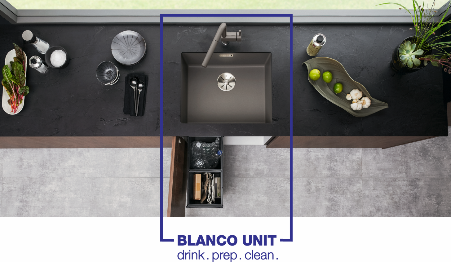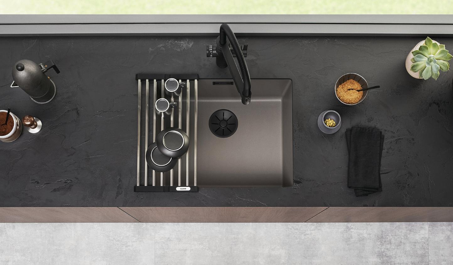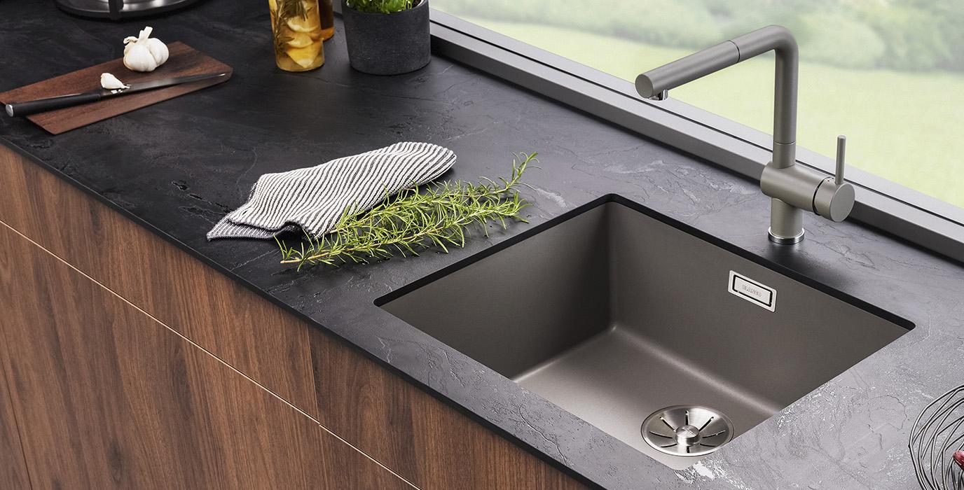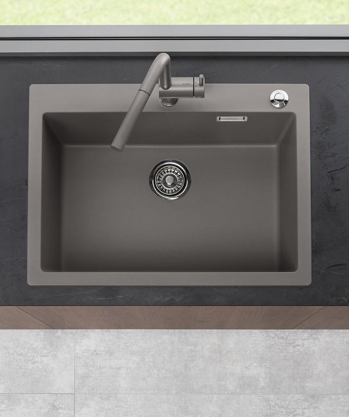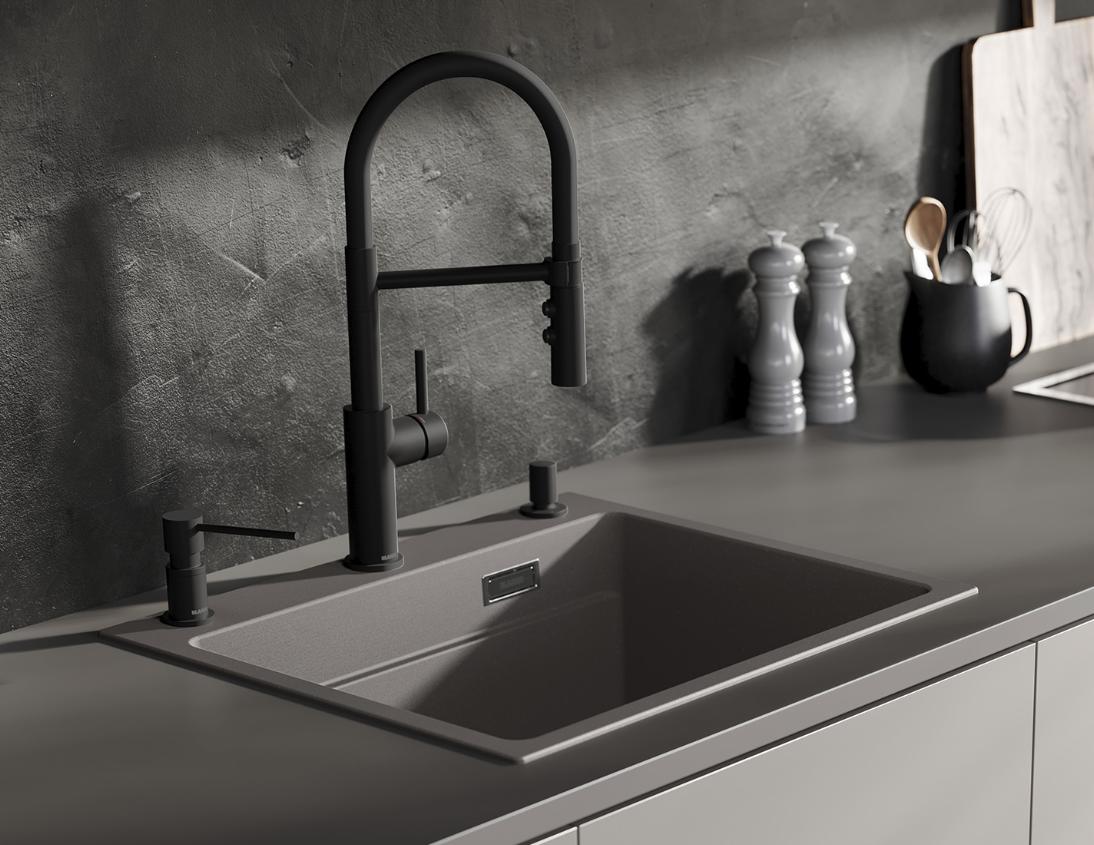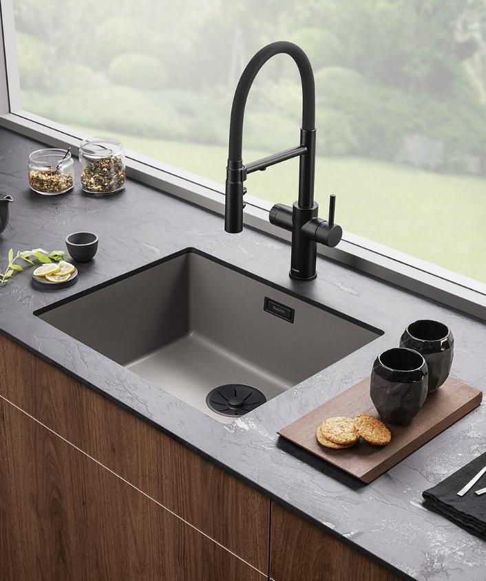 Du kan også bruge sorte detaljer med vulkangrå og lade elementerne omkring køkkenvasken få mere opmærksomhed. Kombiner din køkkenvask i vulkangrå med et armatur, afløbssæt eller andet tilbehør i sort mat, der skaber en elegant, mat kontrast til den varme, grå farve og giv køkkenindretningen ekstra power.