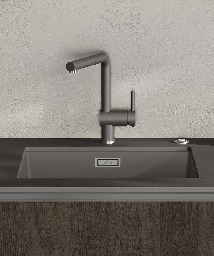 En af fordelene ved Silgranit-vaskene er, at du kan vælge et køkkenarmatur og evt. en LATO sæbedispenser i Silgranit-look og på den måde opnå et 100% farvematch, der skaber et gennemført og strømlinet look i køkkenet. På den måde kan den vulkangrå Silgranit-farve smelte naturligt ind med køkkenets øvrige elementer.