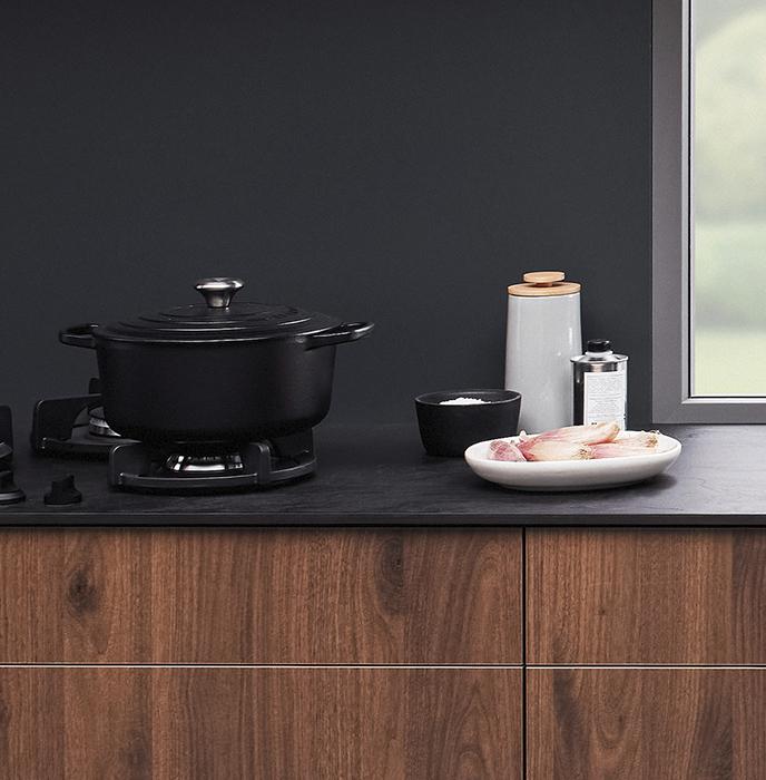 Lad den varme vulkangrå farve smelte ind med bordpladen som en diskret detalje i køkkenet, eller bruge farven i kombination med matsorte detaljer for et stærkt, kontrastfuldt udtryk.
